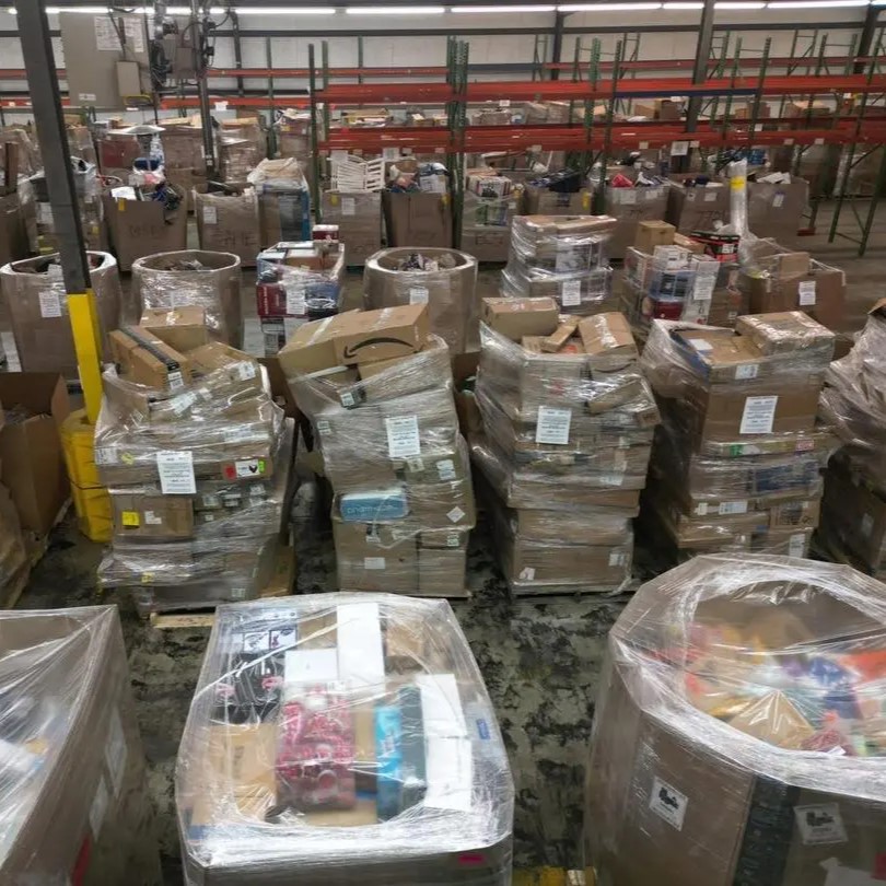 Each pallet contains a wide mix of consumer goods, and no two pallets are identical.